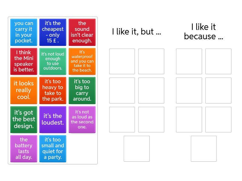 I like it, but ...: it's not loud enough to use outdoors., it's too big to carry around., I think the Mini speaker is better., it's too heavy to take to the park., it's too small and quiet for a party., it's not as loud as the second one., the sound isn't clear enough., I like it because ...: you can carry it in your pocket., it looks really cool., it's the cheapest - only 15 £ ., it's the loudest., it's got the best design., It's waterproof and you can take it to the beach., the battery lasts all day.,
