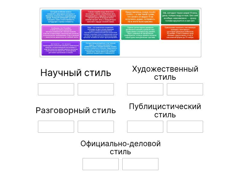 Научный стиль: Вода — это химическое соединение, состоящее из двух атомов водорода и одного атома кислорода (H₂O). Она является универсальным растворителем и играет ключевую роль в поддержании жизни на Земле. Без достаточного количества воды организм человека не может функционировать., Фотосинтез — это процесс превращения солнечной энергии в химическую энергию, осуществляемый растениями. В ходе фотосинтеза вырабатывается кислород и органические вещества, необходимые для жизни организмов на Земле., Художественный стиль: Сквозь густые кроны деревьев пробивался мягкий утренний свет. Туман нежно стелился над землёй, будто укрывал её прозрачным покрывалом, а птицы приветствовали новый день мелодичными трелями., Тонкая струйка воды блестела на солнце, словно серебряная нить, срывающаяся с вершины холодного горного ручья. В воздухе витал свежий аромат леса, и каждый вдох наполнял сердце спокойствием., Разговорный стиль: Представляешь, вчера пошёл гулять — а там такой туман, что ничего не видно! Я аж испугался, думал, потеряюсь. Но в итоге было красиво., Ой, сегодня такая жара! Я весь день только воду и пью. Без неё вообще невозможно — сразу голова кружится и сил нет., Публицистический стиль: Сегодня особенно важно сохранять природные ресурсы и бережно относиться к окружающей среде. Каждый гражданин должен понимать свою ответственность за будущее страны и планеты., Сегодня перед молодёжью стоит важная задача — активно участвовать в развитии страны. Каждый молодой человек должен стремиться к знаниям, поддерживать инновации и вносить свой вклад в будущее Казахстана. Только вместе мы сможем добиться процветания и стабильности., Официально-деловой стиль: Приказываю назначить внеплановую проверку санитарного состояния школьных кабинетов 20 ноября. Ответственные лица обязаны предоставить отчёт в письменной форме до 21 ноября., Сообщаем, что 15 ноября в 10:00 состоится школьная научная конференция. Просим принять участие и подготовить презентации согласно установленным требованиям. Ответственный — заместитель директора по учебной части.,