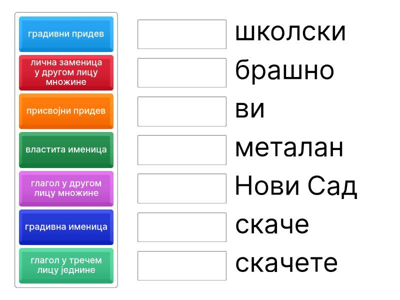 градивна именица - брашно, збирна именица - лишће, властита именица - Нови Сад, заједничка именица - аутомобил, описни придев - шарен, градивни придев - металан, присвојни придев - школски, основни број - три, редни број - трећи, лична заменица у првом лицу једнине - ја, лична заменица у другом лицу једнине - ти, лична заменица у трећем лицу једнине - он, она, оно, лична заменица у првом лицу множине - ми, лична заменица у другом лицу множине - ви, лична заменица у трећем лицу множине - они, оне, она, глагол у првом лицу једнине - скачем, глагол у другом лицу једнине - скачеш, глагол у тречем лицу једнине - скаче, глагол у првом лицу множине - скачемо, глагол у другом лицу множине - скачете, глагол у трећем лицу множине - скачу,