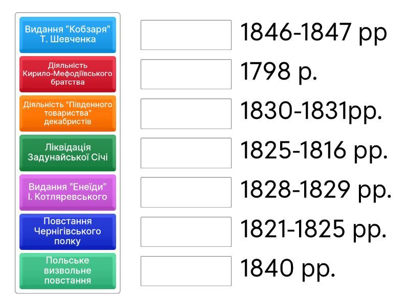 Видання "Енеїди" І. Котляревського - 1798 р., Діяльність "Південного товариства" декабристів - 1821-1825 рр., Повстання Чернігівського полку - 1825-1816 рр., Ліквідація Задунайської Січі - 1828-1829 рр., Польське визвольне повстання - 1830-1831рр., Видання "Кобзаря" Т. Шевченка - 1840 рр., Діяльність Кирило-Мефодіївського братства - 1846-1847 рр,