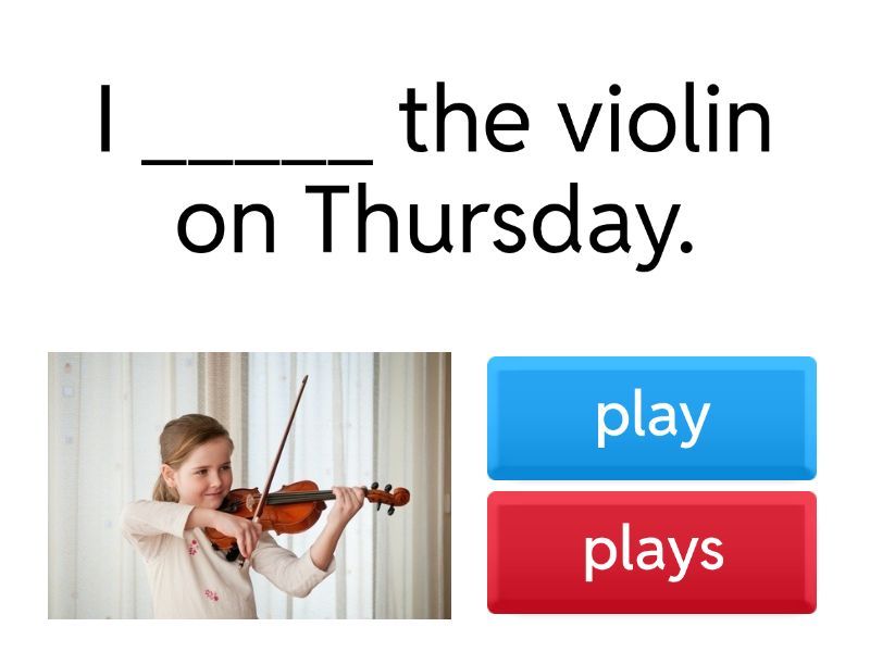 1) I _____ the violin on Thursday. a) play b) plays 2) I ____ the violin on Monday. a) don´t play b) doesn´t play 3) Denis ____ to school by car. a) go b) goes 4) Denis _____ to school by bus. a) don´t go b) doesn´t go 5) How ____ you go to school? a) do b) does 6) My friend _____ at 7 o´clock. a) get up b) gets up 7) He ____ breakfast. a) don´t have b) doesn´t have 8) ___ he have breakfast? a) Do b) Does 9) Mum and Dad ____ tennis on Sunday. a) play b) plays 10) They ____ badminton. a) don´t play b) doesn´t play 11) When ____ they play tennis? a) do b) does 12) My sister ____ posters. a) collect b) collects 13) She ____ badges. a) don´t collect b) doesn´t collect 14) What ____ your sister collect? a) do b) does 15) What ____ your mother do every day? a) do b) does 16) What ____ you do every night? a) do b) does 17) ____ you believe in ghosts? a) does b) do 18) I ____ running a) don´t enjoy b) doesn´t enjoy
