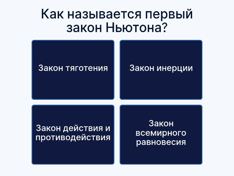 1) Как называется первый закон Ньютона? a) Закон тяготения b) Закон инерции c) Закон действия и противодействия d) Закон всемирного равновесия 2) Согласно первому закону Ньютона, если силы на тело не действуют, то тело: a) Стоит на месте b) Ускоряется c) Двигается равномерно или покоится d) Меняет направление движения 3) Что называют инерциальной системой отсчёта? a) Систему, в которой тело движется с ускорением b) Систему, связанную с любым телом c) Систему, движущуюся по окружности d) Систему, где закон инерции выполняется 4) Кто объяснил, что тело может двигаться без действия силы? a) Паскаль b) Архимед c) Галилей d) Арестотель 5) Как называется свойство тела сохранять скорость неизменной? a) Тяжесть b) Давление c) Трение d) Инертность 6) Что такое инерция a) Явление сохранения скорости при отсутствии внешних воздействий b) Ускорение при действии силы c) Сопротивление воздуха d) Трение между телами 7) Кто первым считал, что для движения тела обязательно нужно действовать на него силой a) Галилей b) Ньютон c) Аристотель d) Коперник 8) Как проявляется инертность тела? a) Тело движется по окружности b) Тело не может мгновенно изменить скорость c) Тело всегда находится в покое d) Тело мгновенно изменяет скорость 9) Кто ввёл понятие инерциальной системы отсчета a) Кеплер b) Ньютон c) Галилей d) Аристотель 10) В каком случае тело изменяет свою скорость a) Когда трение равно нулю b) Когда силы отсутствуют c) Когда масса равна нулю d) Когда силы действуют 11) Почему пассажир наклоняется вперёд при торможении автобуса a) из за инерции b) из за ускорения c) из за тяжести d) из за трения 12) Какая система отсчёта приблизительно инерциальна a) Лифт, начинающий подниматься b) Автобус, резко тормозящий у остановки c) Земля, вращающаяся вокруг своей оси d) Самолёт, совершающий поворот 13) Что происходит в неинерциальной системе отсчёта a) Закон инерции выполняется b) Силы всегда равны нулю c) Скорость не может изменяться d) Закон инерции не выполняется 14) Что происходит с пассажирами при резком увеличении скорости транспорта a) они наклоняются вперед b) они отклоняются назад c) они остаются неподвижными 15) Пример неинерциальной системы: a) корабль на стоянке b) ускоряющийся автомобиль c) земля d) поезд,движущийся равномерно 16) Почему Земля не является абсолютно инерциальной a) Потому что она неподвижна b) Потому что на ней живут люди c) Потому что она вращается d) Потому что нет трения 17) Пример инерциальной системы: a) Автобус, стоящий на остановке b) Самолёт, совершающий вираж c) Лифт, ускоряющийся вверх d) Машина при торможении 18) Что означает - равнодействующая всех сил равна нулю? a) Тело падает b) Тело движется равномерно или покоится c) Тело ускоряется d) Тело изменяет направление 19) Что компенсирует силу тяжести в покоящемся теле a) Сила реакции опоры b) Сила тяги c) Сила давления d) Сила трения 20) Если автомобиль движется равномерно то a) Сила тяги больше силы трения b) Сила тяги меньше силы трения c) Сила тяги равна силе трения d) Сила трения отсутствует 21) Почему камень, брошенный из движущейся машины, летит вперёд, а не прямо вниз? a) Потому что на него действует только сила тяжести b) Потому что у камня есть инерция c) Потому что воздух подталкивает его вперёд d) Потому что машина ускоряется 22) Почему пассажир чувствует толчок при начале движения автобуса a) Из-за силы тяжести b) Из-за силы трения c) Из-за инерции тела d) Из-