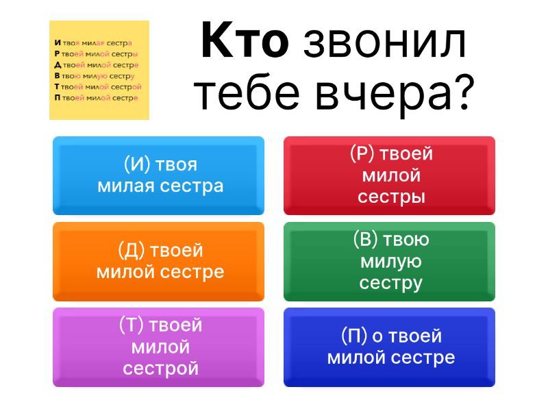 1) Кто звонил тебе вчера? a) (И) твоя милая сестра b) (Р) твоей милой сестры c) (Д) твоей милой сестре d) (В) твою милую сестру e) (Т) твоей милой сестрой f) (П) о твоей милой сестре 2) У кого завтра экзамен? У ... a) (И) твоя милая сестра b) (Р) твоей милой сестры c) (Д) твоей милой сестре d) (В) твою милую сестру e) (Т) твоей милой сестрой f) (П) о твоей милой сестре 3) Кому ты подаришь книгу? a) (И) твоя милая сестра b) (Р) твоей милой сестры c) (Д) твоей милой сестре d) (В) твою милую сестру e) (Т) твоей милой сестрой f) (П)о твоей милой сестре 4) Кого ты видел в парке? a) (И) твоя милая сестра b) (Р) твоей милой сестры c) (Д) твоей милой сестре d) (В) твою милую сестру e) (Т) твоей милой сестрой f) (П) о твоей милой сестре 5) Кого ты пригласили на праздник? a) (И) твоя милая сестра b) (Р) твоей милой сестры c) (Д) твоей милой сестре d) (В) твою милую сестру e) (Т) твоей милой сестрой f) (П) о твоей милой сестре 6) Кем ты гордишься? a) (И) твоя милая сестра b) (Р) твоей милой сестры c) (Д) твоей милой сестре d) (В) твою милую сестру e) (Т) твоей милой сестрой f) (П) о твоей милой сестре 7) С кем ты часто разговариваешь? С ... a) (И) твоя милая сестра b) (Р) твоей милой сестры c) (Д) твоей милой сестре d) (В) твою милую сестру e) (Т) твоей милой сестрой f) (П) о твоей милой сестре 8) С кем он дружит? С ... a) (И) твоя милая сестра b) (Р) твоей милой сестры c) (Д) твоей милой сестре d) (В) твою милую сестру e) (Т) твоей милой сестрой f) (П) о твоей милой сестре 9) О ком ты всегда думаешь? a) (И) твоя милая сестра b) (Р) твоей милой сестры c) (Д) твоей милой сестре d) (В) твою милую сестру e) (Т) твоей милой сестрой f) (П) о твоей милой сестре 10) О ком вы вспомнили вчера? a) (И) твоя милая сестра b) (Р) твоей милой сестры c) (Д) твоей милой сестре d) (В) твою милую сестру e) (Т) твоей милой сестрой f) (П) о твоей милой сестре 11) Кому ты позвонил вечером? a) (И) твоя милая сестра b) (Р) твоей милой сестры c) (Д) твоей милой сестре d) (В) твою милую сестру e) (Т) твоей милой сестрой f) (П) о твоей милой сестре 12) У кого длинные волосы? У... . a) (И) твоя милая сестра b) (Р) твоей милой сестры c) (Д) твоей милой сестре d) (В) твою милую сестру e) (Т) твоей милой сестрой f) (П) о твоей милой сестре 13) У кого нет свободного времени? У... . a) (И) твоя милая сестра b) (Р) твоей милой сестры c) (Д) твоей милой сестре d) (В) твою милую сестру e) (Т) твоей милой сестрой f) (П) о твоей милой сестре 14) Кого зовут Полина? a) (И) твоя милая сестра b) (Р) твоей милой сестры c) (Д) твоей милой сестре d) (В) твою милую сестру e) (Т) твоей милой сестрой f) (П) о твоей милой сестре 15) К кому ты идёшь? К ... . a) (И) твоя милая сестра b) (Р) твоей милой сестры c) (Д) твоей милой сестре d) (В) твою милую сестру e) (Т) твоей милой сестрой f) (П) о твоей милой сестре 16) У кого ты был? У... . a) (И) твоя милая сестра b) (Р) твоей милой сестры c) (Д) твоей милой сестре d) (В) твою милую сестру e) (Т) твоей милой сестрой f) (П) о твоей милой сестре 17) Кому 22 года? a) (И) твоя милая сестра b) (Р) твоей милой сестры c) (Д) твоей милой сестре d) (В) твою милую сестру e) (Т) твоей милой сестрой f) (П) о твоей милой сестре 18) О ком писали в газете? a) (И) твоя милая сестра b) (Р) твоей милой сестры c) (Д) твоей милой сестре d) (В) твою милую сестру e) (Т) твоей милой сестрой f) (П) о твоей милой сестре 19) Чья эта книга? a) (И) твоя милая сестра b) (Р) твоей милой сестры c) (Д) твоей милой сестре d) (В) твою милую сестру e) (Т) твоей милой сестрой f) (П) о твоей милой сестре