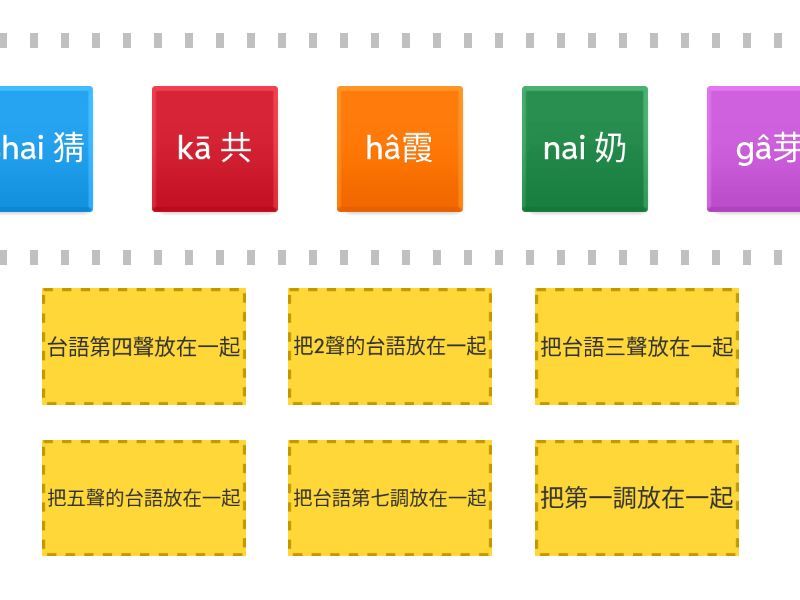 台語第四聲放在一起: ah啊, bah 肉, bat 捌, that 踢, ap 壓, kap 合, ak 沃, kak 角, 把2聲的台語放在一起: Kám感, tńg轉, bí米, buán滿, bué尾, 把台語三聲放在一起: ài愛, ànn向, hàu孝, hù付, huà化, 把五聲的台語放在一起: gâ芽, pâ爸, tshâ柴, bâ麻, hâ霞, 把台語第七調放在一起: ām頷, hām 和, tsām 站, hā夏, kā 共, 把第一調放在一起: ai 哎, khai 開, nai 奶, thai 胎, tshai 猜,