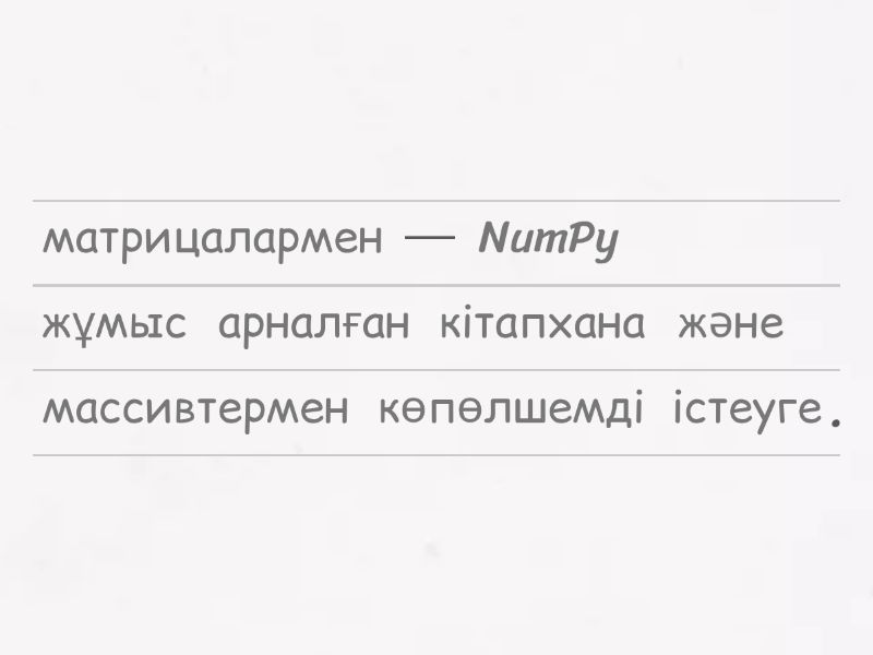NumPy — көпөлшемді массивтермен және матрицалармен жұмыс істеуге арналған кітапхана., Pandas — кестелік және құрылымды деректерді өңдеуге арналған Python кітапханасы., NumPy атауы Numerical Python тіркесінен шыққан., Pandas атауы Panel Data сөз тіркесінен алынған.,