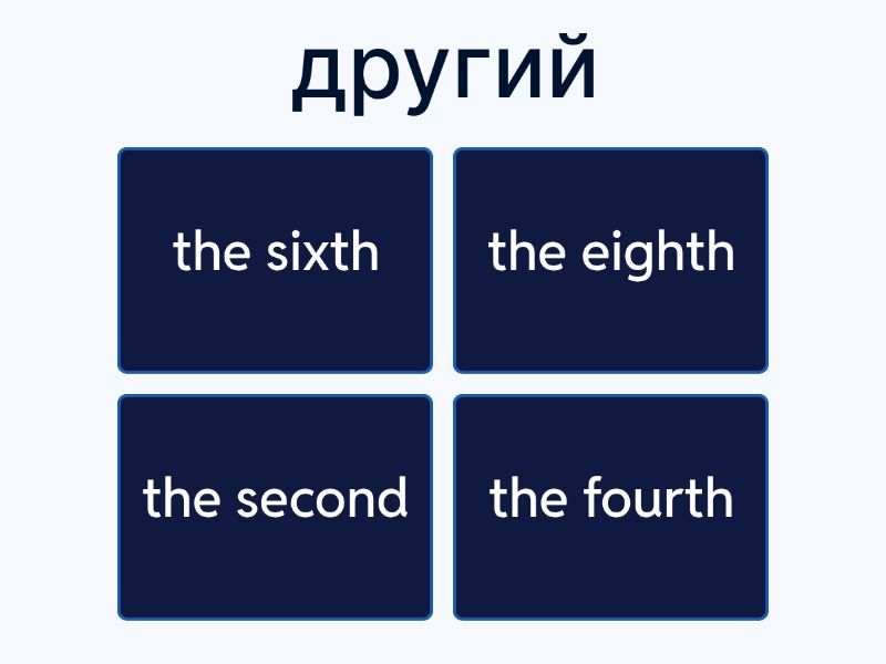 1) другий a) the sixth b) the eighth c) the second d) the fourth 2) перший a) the second b) the sixth c) the fifth d) the first 3) четвертий a) the fourth b) the seventh c) the third d) the tenth 4) третій a) the eighth b) the third c) the fifth d) the fourth 5) шостий a) the eighth b) the first c) the sixth d) the second 6) п’ятий a) the fifth b) the third c) the ninth d) the fourth 7) восьмий a) the second b) the eighth c) the third d) the first 8) десятий a) the sixth b) the tenth c) the ninth d) the fourth 9) сьомий a) the seventh b) the sixth c) the third d) the second 10) дев’ятий a) the tenth b) the ninth c) the second d) the third