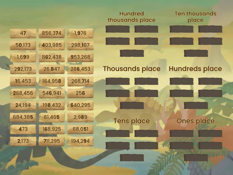 Hundred thousands place: 268,456, 953,268, 640,295, 711,295, 403,985, Ten thousands place: 168,925, 862,438, 292,173, 24,194, 16,453, Thousands place: 198,432, 286,453, 2,173, 50,173, 546,941, Hundreds place: 268,714, 26,847, 1,976, 473, 298,167, Tens place: 194,294, 68,051, 1,699, 2,989, 856,374, Ones place: 164,958, 684,385, 61,465, 256, 47,