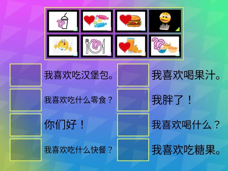 你们好!, 我喜欢吃什么快餐?, 我喜欢吃汉堡包。, 我喜欢吃什么零食?, 我喜欢吃糖果。, 我喜欢喝什么?, 我喜欢喝果汁。, 我胖了!,
