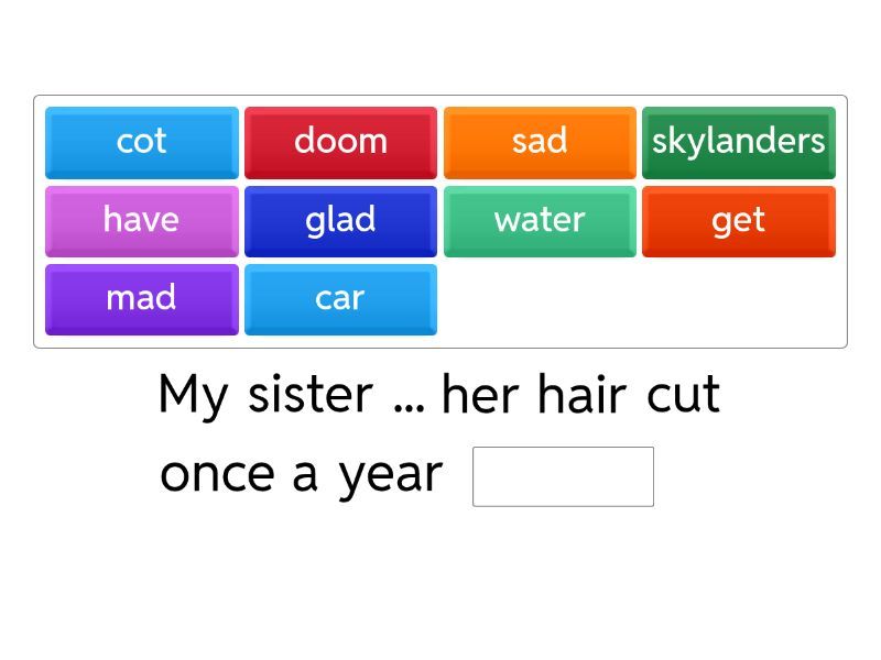 My sister ... her hair cut once a year ____ We ... pizza delivered every Saturday evening ____ Louis ... ... his head shave at 10 a.m. later today, to collect money for charity ____ ____ I ... my nails done yesterday ____ My parents ... a new sofa delivered to our house yesterday ____ I always ... my cloth ironed by my dad ____ Last week we ... our house tidied up ____ My dad ... the house painted every three years ____ He ... his phone fixed yesterday. ____ I ... my car washed ____