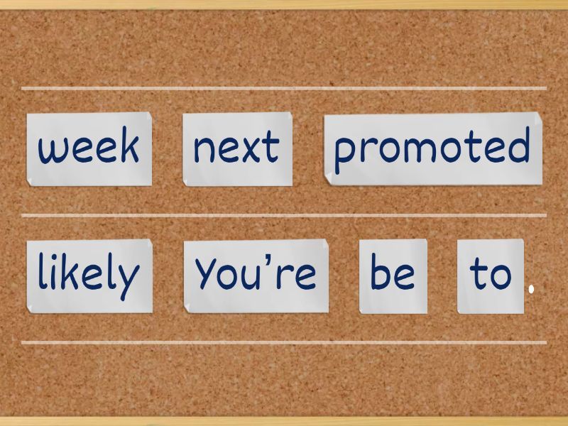 You’re likely to be promoted next week., It’s unlikely that they’ve received the documents yet., Maisy is certain to have known about this., They’re likely to be discussing the matter now., Rafał is certain to have been in the meeting., It’s highly likely that we’re going to be taken over next year., We can be certain that we will have some homework.,