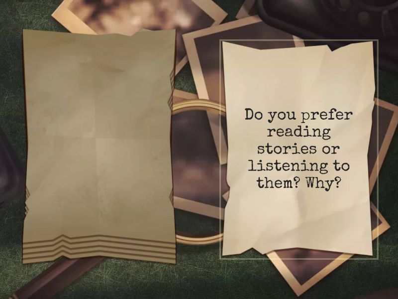 What role do stories play in your life, and why are they important to you?, How do you think storytelling can help us understand different cultures or perspectives?, Do you prefer reading stories or listening to them? Why?, What types of stories do you enjoy the most, such as fiction, non-fiction, or personal anecdotes?, How do you feel when someone shares a personal story with you?, How have stories influenced your beliefs or values over time?.