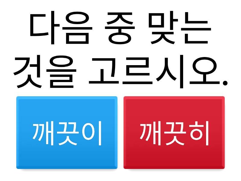 1) 다음 중 맞는 것을 고르시오. a) 깨끗이 b) 깨끗히 2) 성난 발길에______. a) 짖밟히다 b) 짓밟히다 3) 다음 중 맞는 것을 고르시오. a) 깍다 b) 깎다 4) 너의_____꿈을 펼치길 바라 a) 못다 이룬 b) 못 다 이룬 5) 다음 중 맞는 것을 고르시오. a) 털복숭이 b) 털북숭이 6) 당신의 나이를 적으시오. a) 12 b) 13 c) 14 d) 100 e) 2 f) 54