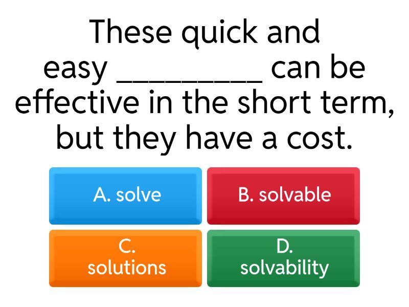 1) These quick and easy _________ can be effective in the short term, but they have a cost.  a) A. solve  b) B. solvable c) C. solutions d) D. solvability 2) He was looking at his parents _________, waiting for recommendations. a) A. obey  b) B. obedience c) C. obedient d) D. obediently 3) The interviews with parents showed that the vast majority were _________ of teachers. a) A. support  b) B. supportive c) C. supporter d) D. supporting 4) It is _________ of you to leave the medicine where the children could reach it. a) A. care  b) B. caring c) C. careless d) D. careful 5) For _________ reasons, passengers are requested not to leave any luggage unattended. a) A. secure  b) B. securely c) C. security d) D. securing 6) The leader of the explorers had the great __________ in his native guide. a) A. confident  b) B. confidence c) C. confidential d) D. confidentially 7) We are impressed by his __________ to help us with the hard mission. a) A. will  b) B. willing c) C. willingness d) D. willingly 8) Although they are twins, they have almost the same appearance but they are seldom in __________ a) A. agree  b) B. agreeable c) C. agreement d) D. agreeably 9) The more __________ and positive you look, the better you will feel. a) A. confide  b) B. confident c) C. confidently d) D. confidence 10) It is reported that humans are the main reason for most species' declines and habitat __________ and degradation are the leading threats. a) A. destroy  b) B. destructive c) C. destructor d) D. destruction