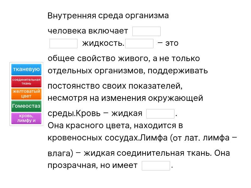 Внутренняя среда организма человека включает ____ ____ жидкость.____ – это общее свойство живого, а не только отдельных организмов, поддерживать постоянство своих показателей, несмотря на изменения окружающей среды.Кровь – жидкая ____. Она красного цвета, находится в кровеносных сосудах.Лимфа (от лат. лимфа – влага) – жидкая соединительная ткань. Она прозрачная, но имеет ____.