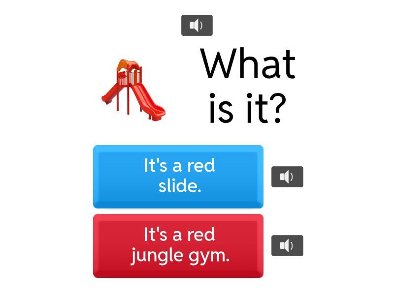 1) What is it?  a) It's a red slide.  b) It's a red jungle gym. 2) What is it? a) It's an orange and yellow see-saw.  b) It's an orange and yellow swing. 3) What is it?  a) It's a red swing.  b) It's a red see-saw.  4) What is it?  a) It's a pink slide. b) It's a pink jungle gym.  5) What is it?  a) It's a white see-saw. b) It's a white jungle gym. 6) What is it? a) It's a playground. b) It's a school. 7) What is it?  a) It's a blue monkey bar. b) It's a blue jungle gym. 8) What is this?  a) It's a yellow and blue slide.  b) It's a yellow and blue jungle gym.