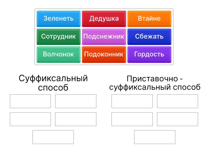 Суффиксальный способ : Гордость , Волчонок , Дедушка, Зеленеть , Приставочно - суффиксальный способ : Сбежать  , Подоконник , Подснежник , Сотрудник , Втайне,