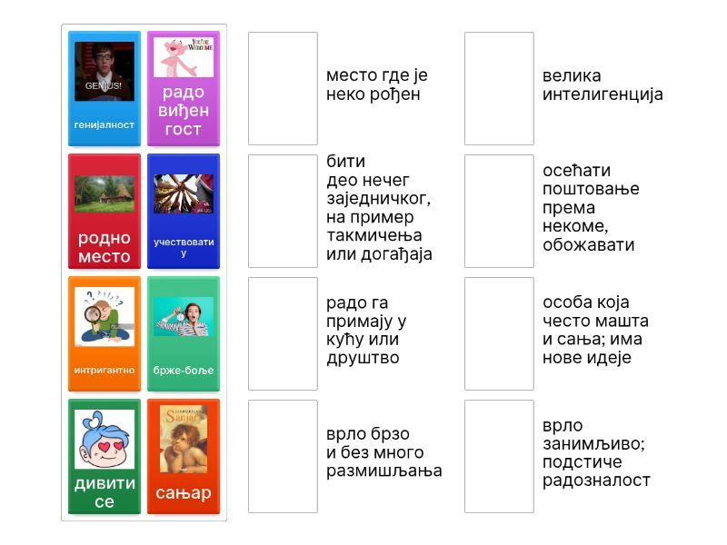 интригантно - врло занимљиво; подстиче радозналост, генијалност - велика интелигенција, сањар - особа која често машта и сања; има нове идеје, наизменична струја - тип електричне енергије који мења смер, славан - веома познат у јавности, узак - није широк, гајити - неговати, чувати, бринути се, дивити се - осећати поштовање према некоме, обожавати, учествовати у - бити део нечег заједничког, на пример такмичења или догађаја, брже-боље - врло брзо и без много размишљања, радо виђен гост - радо га примају у кућу или друштво, сићи/силазити - спустити се са вишег места на ниже, анђео - добра, нежна особа (или духовно биће), откриће - нешто ново и важно што је неко направио, родно место - место где је неко рођен,