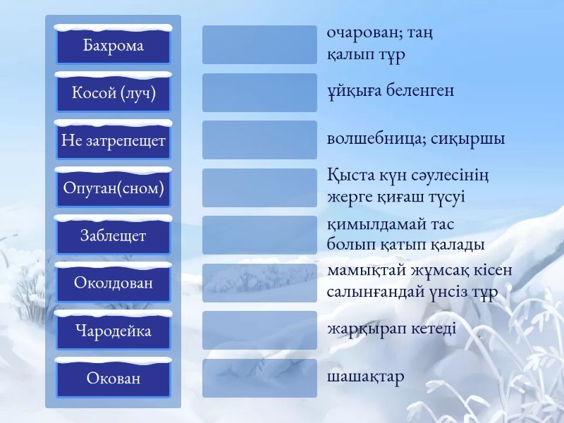 Чародейка - волшебница; сиқыршы, Околдован - очарован; таң қалып тұр, Бахрома - шашақтар, Опутан(сном) - ұйқыға беленген, Окован - мамықтай жұмсақ кісен салынғандай үнсіз тұр, Косой (луч) - Қыста күн сәулесінің жерге қиғаш түсуі, Не затрепещет - қимылдамай тас болып қатып қалады, Заблещет - жарқырап кетеді,
