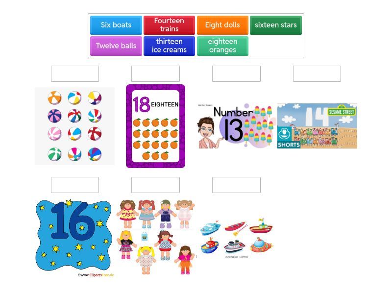 Six dolls, Fourteen trains, Twelve balls, Four bikes, Nine cars, Seven kites, Eight dolls, Six boats, twenty books, twelve squares, fifteen balloons, eighteen oranges, thirteen ice creams, sixteen stars,