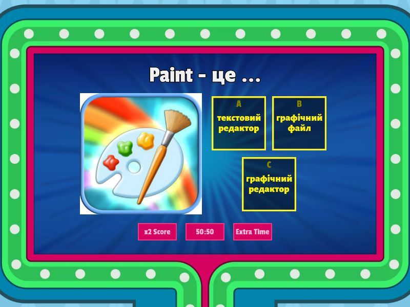 1) Paint - це ... a) текстовий редактор b) графічний файл c) графічний редактор 2) Який інструмент треба використати для зафарбування об'єктів? a) заливка b) палітра кольорів c) пензель 3) За допомогою якого інструмента можна стерти об'єкт? a) розпилювач b) гумка c) вирізання 4) Що зображено на малюнку? a) палітра кольорів b) фігури c) квадрати 5) Який з інструментів призначений для малювання ліній довільної форми? a) олівець b) заливка c) палітра кольорів 6) За домогою графічного редактора Paint можна... a) редагувати вид і накреслення буква b) створювати і редагувати графічні зображення c) будувати графіки