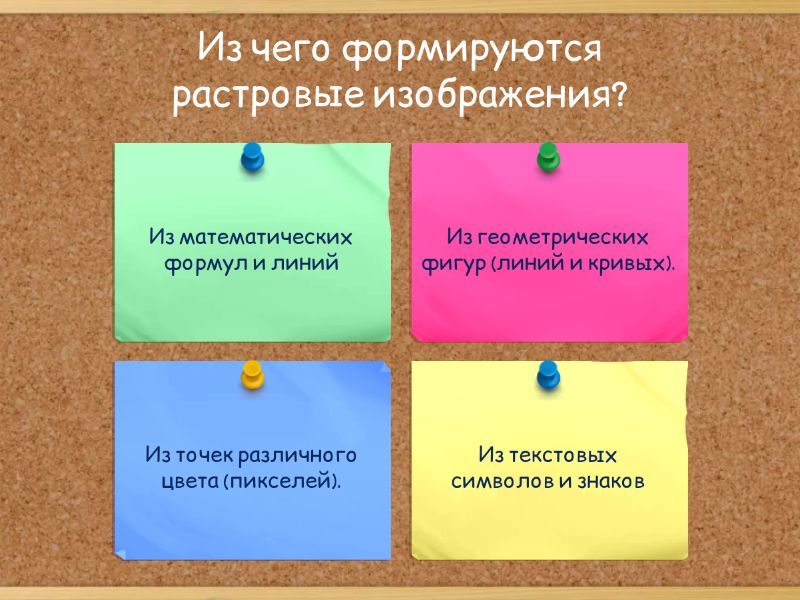 1) Из чего формируются растровые изображения? a) Из математических формул и линий b) Из геометрических фигур (линий и кривых). c) Из точек различного цвета (пикселей). d) Из текстовых символов и знаков 2) Как называется наименьший элемент изображения, который отображается на экране? a) Точка фокуса. b) Пиксель c) Элемент кадра d) Байт 3) Что происходит с качеством растрового рисунка при его увеличении или уменьшении? a) Оно улучшается b) Оно остается неизменным c) Оно улучшается только при уменьшении d) Оно всегда искажается 4) На какие два основных вида делится компьютерная графика? a) Внутренняя и внешняя b) Двухмерная и трехмерная c) Растровая и векторная d) Мониторная и печатная 5) Для чего нужен графический редактор? a) Для создания и редактирования видео. b) Для набора и форматирования текста. c) Для работы с графическими изображениями, их обработки и редактирования. d) Для прослушивания музыки. 6) На какие два типа делятся графические редакторы? a) 2D и 3D. b) Простые и сложные. c) Растровые (точечные) и векторные. d) Системные и прикладные. 7) Какой редактор для рисования входит в стандартные программы операционной системы Windows? a) Adobe Photoshop. b) Графический редактор Paint. c) GIMP. d) CorelDRAW. 8) Какое сочетание клавиш позволяет быстро сохранить работу над рисунком? a) Ctrl + S. b) Ctrl + P. c) Ctrl + C. d) Ctrl + V.
