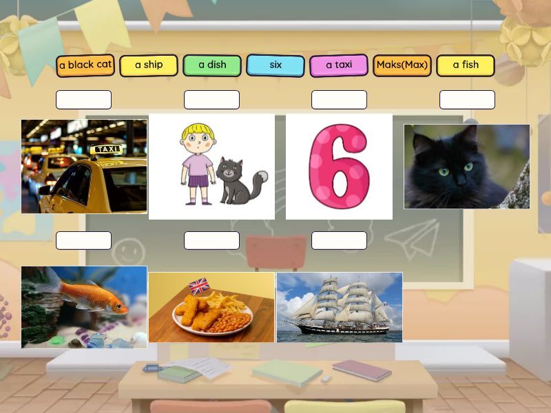 Maks(Max), six, a dish, a fish, a ship, a taxi, a black cat,