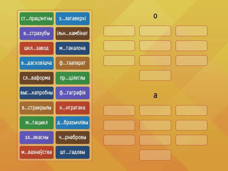 о: д...бразычлівы, ільн...камбінат, сл...ваформа, м...вазнаўства, ф...таапарат, шт...гадовы, пр...цілеглы, м...такалона, шкл...завод, к...нтратака, а: ст...працэнтны, ф...таграфія, ч...рнабровы, зл...якасны, в...стракрылы, з...латаверхі, выс...капробны, в...дасховішча, в...стразубы, м...тацыкл,