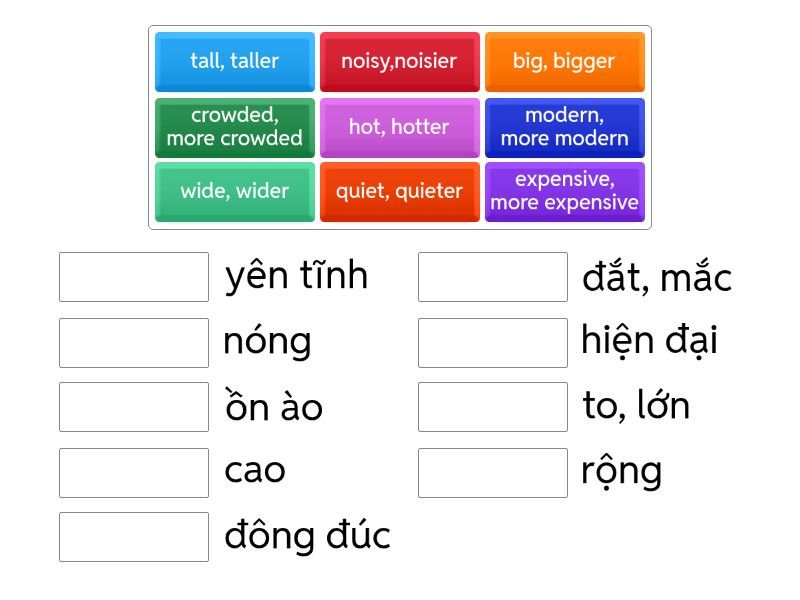 tall, taller - cao , noisy,noisier - ồn ào , big, bigger - to, lớn , peaceful, more peaceful - yên bình , exciting, more exciting - thú vị, náo nhiệt, busy, busier - bận rộn , hot, hotter - nóng, small, smaller - nhỏ , old , older - cũ , wide, wider - rộng , delicious, more delicious - ngon, cheap, cheaper - rẻ , crowded, more crowded - đông đúc , quiet, quieter - yên tĩnh, modern, more modern - hiện đại, boring, more boring - buồn tẻ, chán, expensive, more expensive - đắt, mắc,