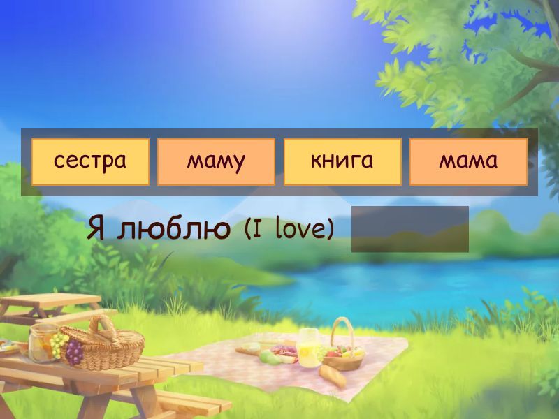 Я люблю (I love) ____ Папа читает (Father is reading) ____ Брат часто слушает (Brother often listens to) ____ Ты слушаешь (Do you often obey) ____? Мы часто едим (We often eat) ____ Она редко ест (She rarely eats) ____ Я вижу (I see) ____ Я люблю пить (I love to drink) ____ Мария часто готовит (Mary often cooks) ____ Мы изучаем русский (We are learning Russian) ____ Родители любят (Parents love) ____