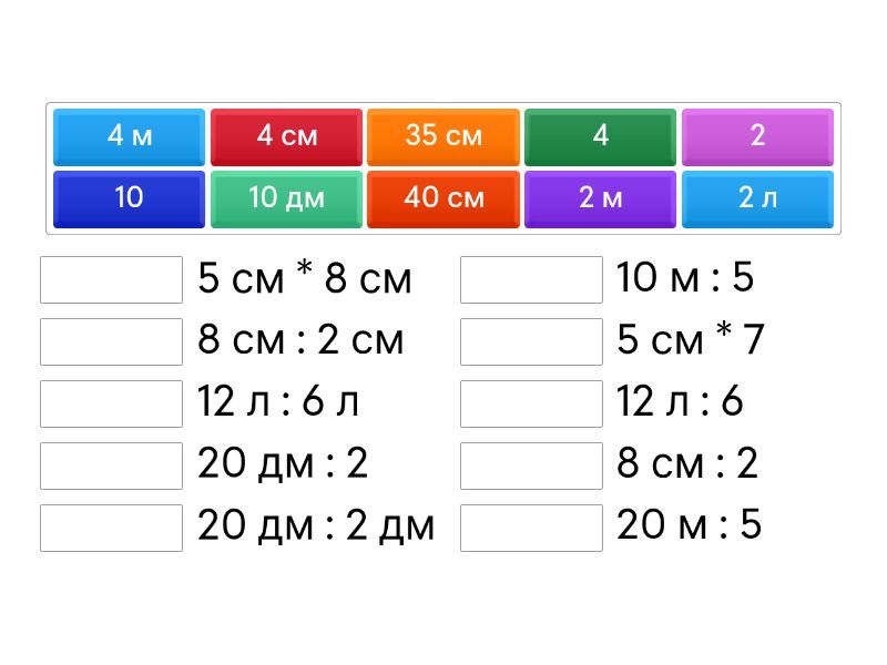 4 см - 8 см : 2 , 10 - 20 дм : 2 дм , 4 м - 20 м : 5 , 40 см - 5 см * 8 см , 4 - 8 см : 2 см , 10 дм - 20 дм : 2 , 2 м - 10 м : 5 , 35 см - 5 см * 7 , 2 л - 12 л : 6, 2 - 12 л : 6 л ,