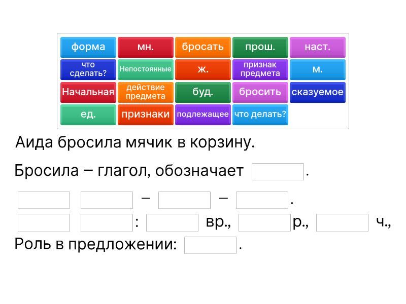Аида бросила мячик в корзину. Бросила – глагол, обозначает ____. ____ ____ – ____ – ____. ____ ____: ____ вр., ____р., ____ ч., Роль в предложении: ____. В весеннем лесу ты услышишь чудесное пение птиц. Услышишь – глагол, обозначает ____. ____ ____ – ____ – ____. Непостоянные признаки: ____ вр., ____ ч., ____р. Роль в предложении: ____. Солнечные лучи съедают последний снег. Съедают – глагол, обозначает ____. Начальная форма – ____ – ____. Непостоянные признаки: ____ вр., ____ ч., ____р. Роль в предложении: ____.