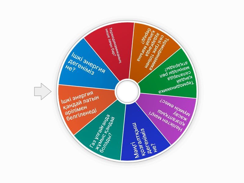 1) Ішкі энергия дегеніміз не? a) Заттарды құрайтын бөлшектердің энергиясы b) Денелердің әсерлесу энергиясы c) Денелер қозғалысының энергиясы 2) Термодинамиканың неше заңы бар? a) 2 b) 3 c) 4 3) Термодинамика сөзі грек тілінен аударғанда қандай мағына береді? a) Жылу және күш b) Жұмыс және күш c) Қызу және салқындау 4) Термодинамика қандай салаларда маңызды рөл атқарады? a) Тоқыма өнеркәсібі b) Өндіріс саласы c) Өнеркәсіптік инженерия 5) Неліктен мәңгі қозғалтқыш жасау мүмкін емес? a) Мәңгі қозғалатын дене жоқ b) Жүйеге энергия берілмесе, жұмыс жасалынбайды c) Оған өте жоғары температура керек 6) Мәңгі қозғалтқыш дегеніміз не? a) Сырттан энергия алмай, шектеулі уақыт бойы жұмыс жасай алатын машина b) Автомобильдің қозғалтқышы c) Сырттан энергия алмай, шексіз ұзақ уақыт бойы жұмыс жасай алатын машина 7) Газ ұлғайғанда жұмыс қандай болады? a) Оң b) Жұмыс жасалмайды c) Теріс 8) Ішкі энергия қандай латын әріпімен белгіленеді a) u b) p c) v