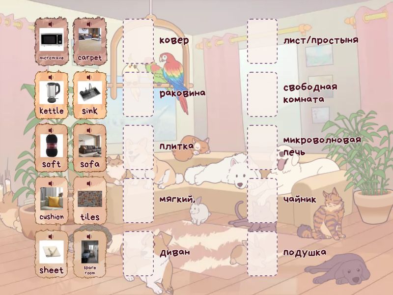 share - делиться, en-suite bathroom - собственная ванная комната в номере, own - собственный, spare room - свободная комната, study room - кабинет, dishwasher - посудомойка, untility room - подсобное помещение, washing machine - стиральная машина., microwave - микроволновая печь, tap - кран, kettle - чайник, tiles - плитка, freezer - морозилка, cooker - кухонная плита, oven - духовка, sink - раковина, Cupboard - шкафы, sofa - диван, cushion - подушка, curtains - Шторы, firm - твердый, soft - мягкий,, armchair - кресла, blind - жалюзи, wooden - деревянный, floor - этаж/пол, rug - коврик,, duvet - одеяло,, carpet - ковер, sheet - лист/простыня,