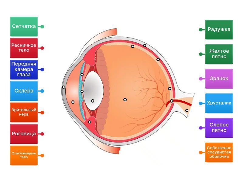 Склера, Роговица, Собственно сосудистая оболочка, Радужка, Зрачок, Передняя камера глаза, Сетчатка, Зрительный нерв, Слепое пятно, Хрусталик, Ресничное тело, Стекловидное тело, Желтое пятно.