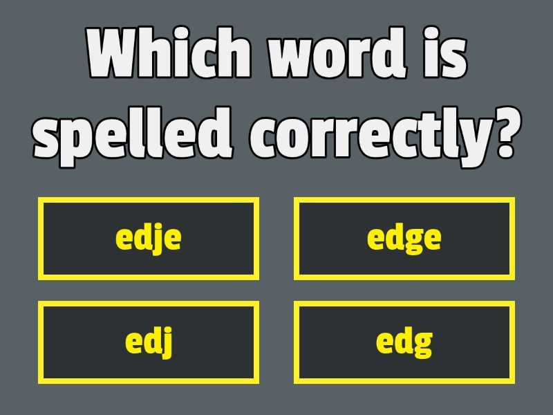 1) Which word is spelled correctly? a) edje b) edge c) edj d) edg 2) Which word is spelled correctly? a) fether b) feether c) feather d) feathir 3) Which word is spelled correctly? a) fens b) fenc c) fence d) fense 4) Which word is spelled correctly? a) funny b) funni c) funi d) funy 5) Which word is spelled correctly? a) goeng b) going c) gooing d) gowing 6) Which word is spelled correctly? a) huney b) huny c) honi d) honey 7) Which word is spelled correctly? a) leters b) letters c) letirs d) lettirs 8) Which word is spelled correctly? a) orang b) orange c) oranje d) oranj 9) Which word is spelled correctly? a) pocet b) pocit c) pockit d) pocket 10) Which word is spelled correctly? a) shoos b) shoose c) shose d) shoes 11) Which word is spelled correctly? a) shoo b) shoe c) sho d) shu 12) Which word is spelled correctly? a) staers b) stairs c) stayrs d) stiers 13) Which word is spelled correctly? a) stream b) streem c) streme d) ctream 14) Which word is spelled correctly? a) tak b) tawk c) talk d) tack 15) Which word is spelled correctly? a) tini b) tinee c) tiny d) tiney 16) Which word is spelled correctly? a) words b) werds c) wards d) wirds 17) Which word is spelled correctly? a) trust b) trost c) truct d) truste 18) Which word is spelled correctly? a) xtra b) extru c) extrah d) extra 19) Which word is spelled correctly? a) dres b) drese c) dress d) driss 20) Which word is spelled correctly? a) besid b) besidee c) beside d) beeside 21) Which word is spelled correctly? a) pruvide b) provide c) provid d) pruvid 22) Which word is spelled correctly? a) cit b) siet c) sight d) cight