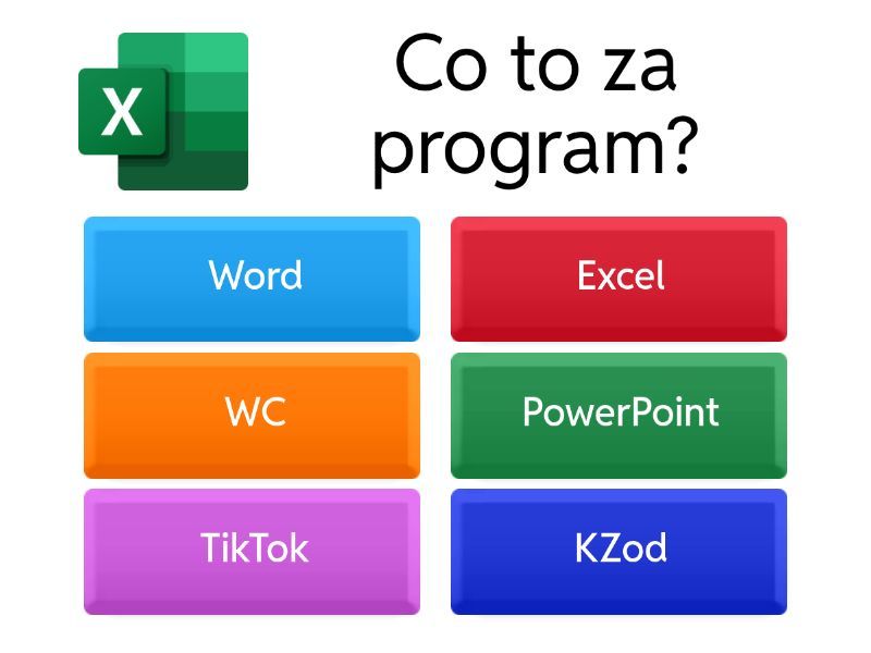 1) Co to za program? a) Word b) Excel c) WC d) PowerPoint e) TikTok f) KZod 2) Z ktorej klasy pojawia się informatyka? a) 1 b) 6 c) 7 d) 5 e) 4 f) 10 3) Co to za gra? a) Durak b) Roblox c) Among Us d) Subway Surf e) Stack f) Standoff 2 4) Co to za program? a) Snapchat b) Vinted c) TikTok d) BeReal e) Spotify f) Like 5) Co to za gra? a) Brawl Stars b) Minecraft c) Township d) Fishdom e) Hay Day f) Clash of Clans