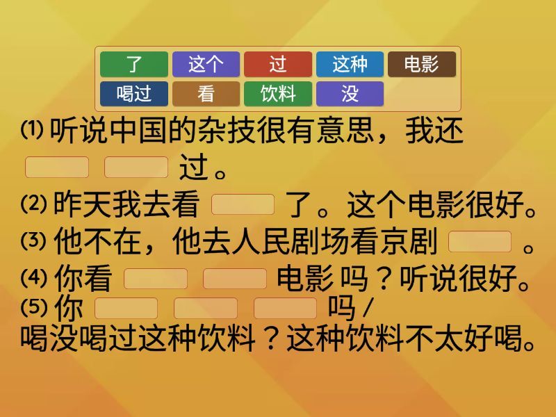 (1) 听说中国的杂技很有意思,我还 ____ ____ 过 。 (2) 昨天我去看 ____ 了 。这个电影很好。 (3) 他不在,他去人民剧场看京剧 ____ 。 (4) 你看 ____ ____ 电影 吗?听说很好。 (5) 你 ____ ____ ____ 吗 / 喝没喝过这种饮料?这种饮料不太好喝。