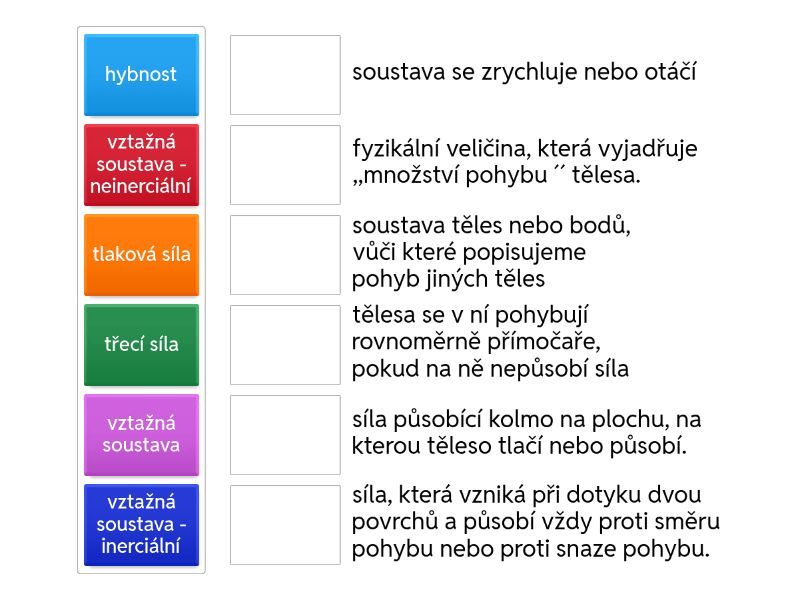 hybnost - fyzikální veličina, která vyjadřuje ,,množství pohybu ´´ tělesa., tlaková síla - síla působící kolmo na plochu, na kterou těleso tlačí nebo působí., třecí síla - síla, která vzniká při dotyku dvou povrchů a působí vždy proti směru pohybu nebo proti snaze pohybu., vztažná soustava - soustava těles nebo bodů, vůči které popisujeme pohyb jiných těles, vztažná soustava - inerciální - tělesa se v ní pohybují rovnoměrně přímočaře, pokud na ně nepůsobí síla, vztažná soustava - neinerciální - soustava se zrychluje nebo otáčí,