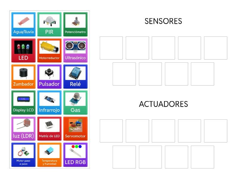 SENSORES: Ultrasónico, Temperatura y humedad, luz (LDR), Infrarrojo, Pulsador, Agua/lluvia, Gas, Potenciómetro, PIR, ACTUADORES: Servomotor, Motorreductor, LED, Zumbador, Relé, Display LCD, Motor paso a paso, LED RGB, Matriz de LED,