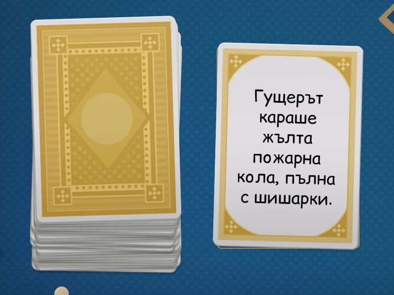 Жабата си сложи шапка и жилетка, защото й беше студено., Мишката изяде цялата къща, а щъркелът се скри в шкафа., Гущерът караше жълта пожарна кола, пълна с шишарки., Щъркелът си купи багаж с клещи и череши., Мъжът си среса косата с лъжица, а ядеше супата с нож., Една голяма круша отиде на плаж с плюшена пижама., Жирафът реши да живее в кашон под душа., Машината за пране сготви пържола за таралежа., Щипката изпи цяло шише с мляко и легна да спи в къщата., Кошът за боклук беше пълен с жълти жълъди и свещи., Жената си обу шала, а шапката сложи на лъжицата., Гущерът шепнеше на жабата, че шкафът е от шоколад., Мишката се убоде на нож, докато караше шейна., Жоро изгаси свещта с клещи, вместо с вода., Щъркелът влезе в гаража, за да си купи пижама., Шапката на мъжа беше пълна с пушек и жаби., Къщата се скри от мишката зад голям таралеж., Черешата облече топъл кожух и хвана щипката., Багажът на пощата беше пълен с лъжици и шишета., Жабата, мишката и гущерът си построиха къща от желе..