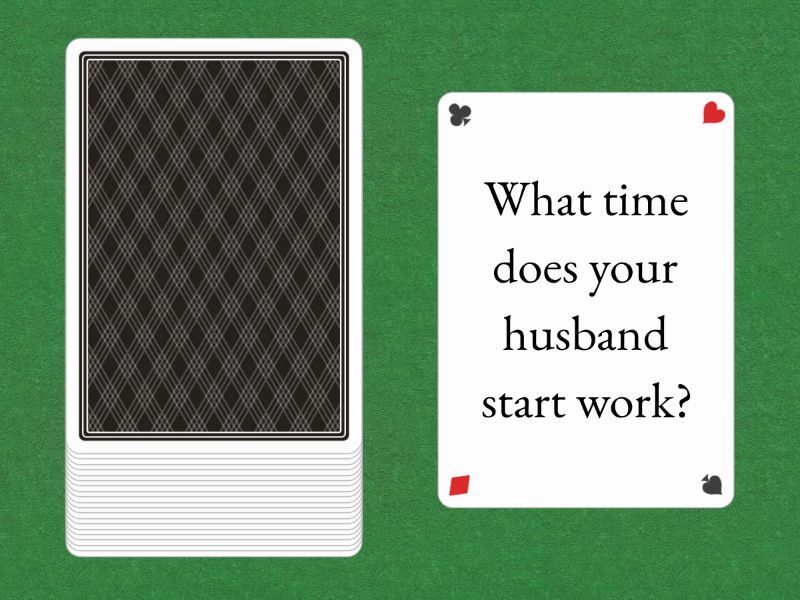 What time do you usually wake up on weekdays?, Do you have a shower in the morning or in the evening?, How much time do you need to get dressed?, Do you have coffee for breakfast?, What does your son usually have for breakfast?, How often do you do exercise?, Does your husband walk to work?, What time does your husband start work?, Where do you usually have lunch?, What time does your husband finish work?, What time do you usually get home after parties with girls?, Who usually goes shopping in your family?, Do you often make dinner?, How often do you have pizza for dinner?, What do you do to relax in the evening?, Do you always do your English homework? 😈, Do you prefer having a bath or a shower?, Do you usually go to bed late or early?, Do you usually sleep for 8 hours? or you sleep less?, What housework do you usually do?, Do you often use public transport?.