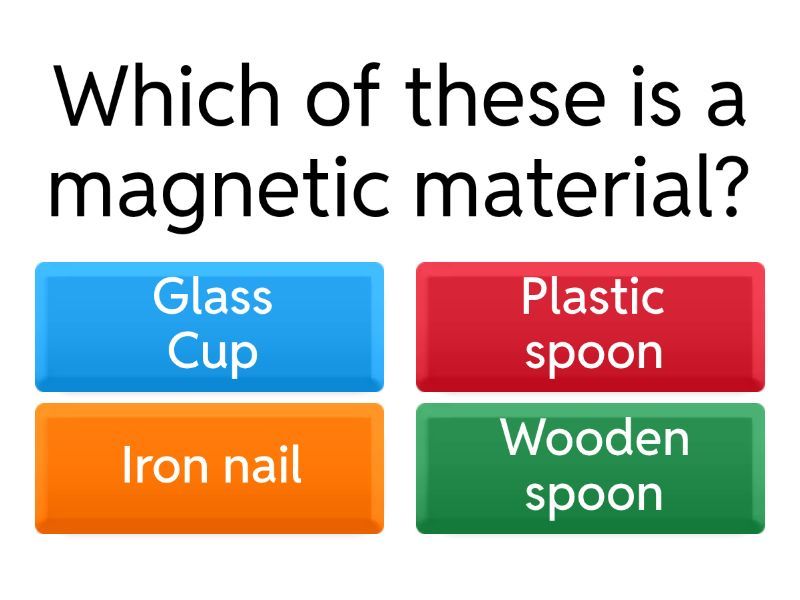 1) Which of these is a magnetic material? a) Glass Cup b) Plastic spoon c) Iron nail d) Wooden spoon 2) What happens when two north poles are brought close together? a) They attract b) They repel c) Nothing happens d) They stick together 3) True or False: Magnets have only one pole. a) True b) False 4) Which device uses an electromagnet? a) Doorbell b) Candle c) Chalkborad d) Pencil 5) What is needed to make an electromagnet? a) Magnet and rubber b) Plastic tube and string c) Water and salt d) Iron nail, wire, and battery 6) True or False: Electromagnets work without electricity. a) True b) Flase 7) Which part of an electromagnet carries the current? a) Iron Core b) Battery c) Copper Wire d) Magnet 8) How can you make an electromagnet stronger? a) Increase the number of wire coils b) Remove the battery c) Use fewer coils d) Use a plastic core 9) What is the difference between a permanent magnet and an electromagnet? a) Electromagnets are always on b) Electromagnets need electricity to work c) Permanent magnets need electricity d) They are the same 10) Which of these is NOT a use of magnets? a) MRI machine b) Compass c) Microwave d) Fridge door