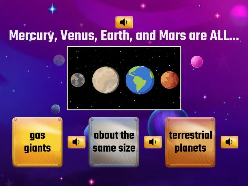 1) Mercury, Venus, Earth, and Mars are ALL... a) gas giants b) about the same size c) terrestrial planets 2) Which of these plants are gas giants? (Choose all correct answers.) a) Neptune b) Saturn c) Earth d) Uranus e) Jupiter f) Venus 3) _ is the center of our solar system. a) the moon b) the sun c) the Earth d) Pluto 4) TRUE or FALSE? The sun is larger that all of the planets. a) true b) false 5) TRUE or FALSE? Mercury is the smallest terrestrial planet? a) true b) false 6) Which lists the planets in order from SMALLEST to LARGEST? a) Mars, Mercury, Earth, Venus, Saturn, Uranus, Jupiter, Neptune b) Jupiter, Saturn, Uranus, Neptune, Earth, Mars, Mercury, Venus c) Mercury, Mars, Venus, Earth, Neptune, Uranus, Saturn, Jupiter 7) Which picture shows the planets in order from SMALLEST to LARGEST? a) b) c) 8) Which statement is TRUE? a) Saturn and Earth are both terrestrial planets. b) Saturn and Neptune are both gas giants. c) Mars and Jupiter are both gas giants. 9) Which planet is known as the largest planet in our solar system and a gas giant? a) Jupiter b) Uranus c) Venus 10) Which is true about the order of the planets as shown in the picture? a) Each planet is larger than the one before. b) Each planet has more moons than the one before. c) Each planet is farther from the sun than the one before. 11) Which picture shows the planets in order by distance from the sun? a) b) c) 12) Why do we have a day that is 24 hours long? a) It takes 24 hours for Earth to revolve around the sun. b) It takes 24 hours for Earth to rotate one time. c) It takes 24 hours for the moon to rotate once. 13) It takes 24 hours for Earth to rotate one time. What would happen if Earth rotated faster? a) Days would be longer. b) Days would be shorter. c) Seasons would be shorter. 14) Which is a model of Earth's revolution? a) b) c) 15) This is a model of the solar system. Mercury is the smallest rocky planet. Which numbered planet is Mercury, according to its distance from the sun? a) 4 b) 3 c) 2 d) 1 16) Pick ALL statements that describe the inner planets. a) gaseous b) rocky c) many moons d) few moons e) short revolutions f) long revolutions 17) Pick ALL statements that describe the outer planets. a) gaseous b) rocky c) many moons d) few moons e) short revolutions f) long revolutions 18) The picture shows the sun and the planets in the solar system. What is the picture modeling? a) The order of the planets from the sun. b) What the planets and sun are made of. c) The size relationship between the planets and the sun.