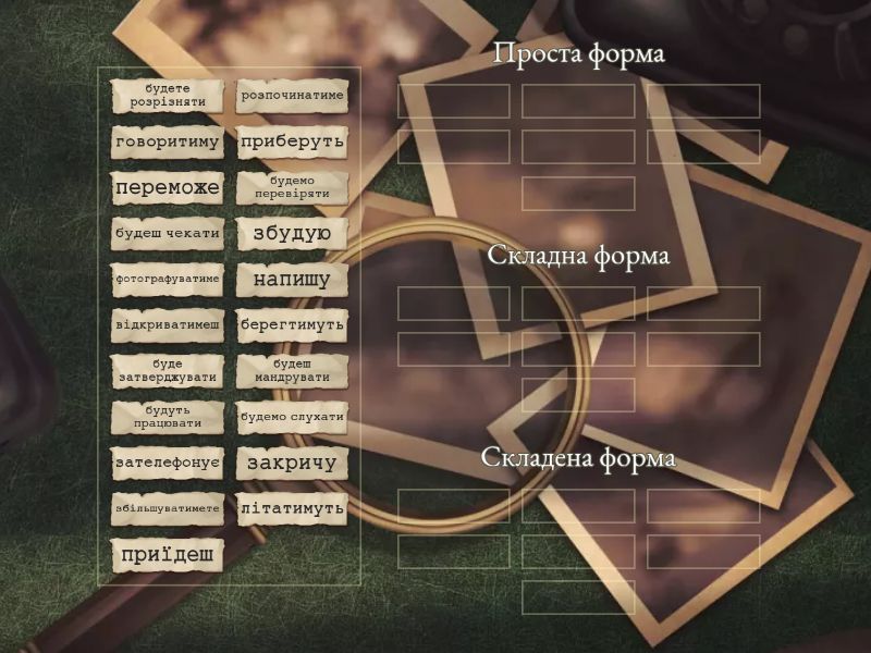 Проста форма: закричу, приїдеш, напишу, приберуть, переможе, зателефонує, збудую, Складна форма: берегтимуть, говоритиму, літатимуть, розпочинатиме, фотографуватиме, відкриватимеш, збільшуватимете, Складена форма: будемо слухати, будеш мандрувати, будуть працювати, буде затверджувати, будете розрізняти, будеш чекати, будемо перевіряти,