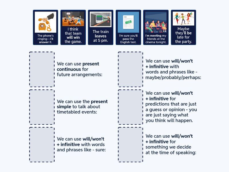 I'm meeting my friends at the cinema tonight. - We can use present continuous for future arrangements:, The train leaves at 5 pm. - We can use the present simple to talk about timetabled events:, I'm sure you'll pass the English test. - We can use will/won't + infinitive with words and phrases like - sure:, Maybe they'll be late for the party. - We can use will/won't + infinitive with words and phrases like - maybe/probably/perhaps:, I think that team will win the game. - We can use will/won't + infinitive for predictions that are just a guess or opinion - you are just saying what you think will happen. , The phone’s ringing—I’ll answer it. - We can use will/won't + infinitive for something we decide at the time of speaking:,