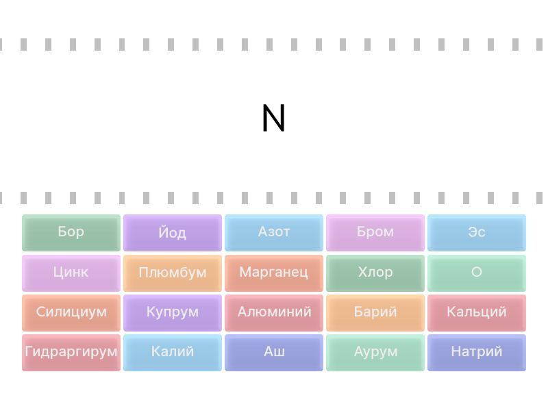 Азот - N, Алюминий - Al, Барий - Ba, Бор - B, Бром - Br, Аш - H, Аурум - Au, Cилициум - Si, Купрум - Cu, Эс - S, Гидраргирум - Hg, Плюмбум - Pg, Хлор - Cl, Цинк - Zn, Натрий - Na, O - O, Марганец - Mn, Йод - I, Калий - K, Кальций - Ca,