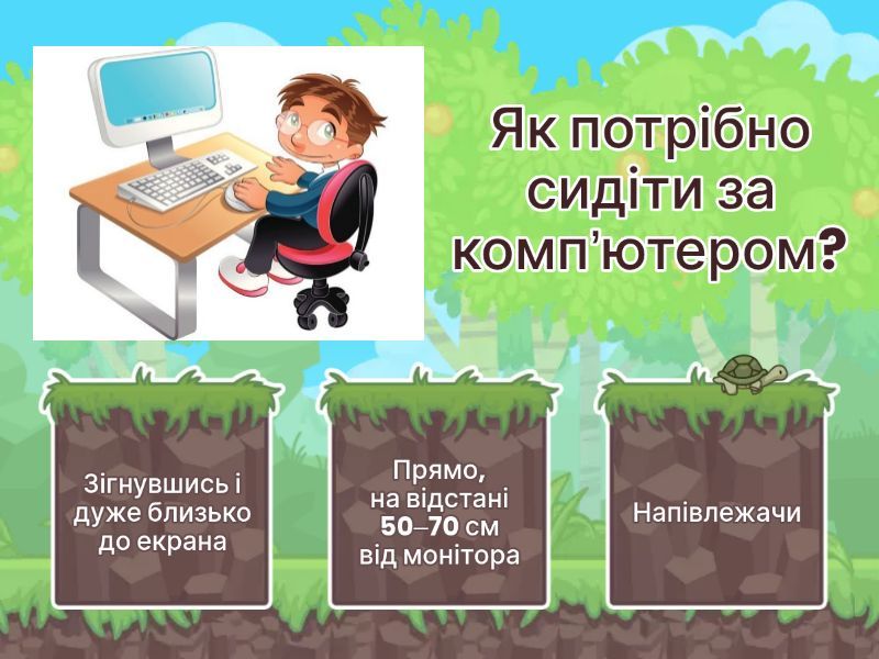 1) Як потрібно сидіти за комп’ютером? a) Зігнувшись і дуже близько до екрана b) Прямо, на відстані 50–70 см від монітора c) Напівлежачи 2) Що потрібно зробити перед початком роботи за комп’ютером? a) Витерти насухо руки b) Витерти монітор ганчіркою c) Випити чай 3) Чи можна їсти або пити за комп’ютером? a) Так, можна b) Ні, не можна c) Лише якщо дуже хочеться 4) Як довго можна працювати за комп’ютером без перерви? a) 1 годину b) 15 хвилин c) 30 хвилин 5) Що треба зробити після роботи за комп’ютером? a) Вимкнути монітор і комп’ютер b) Просто встати й піти c) Залишити все ввімкненим 6) Чому не можна торкатися дротів і розеток? a) Бо можна зламати комп’ютер b) Бо можна отримати електротравму c) Бо це нецікаво 7) Що робити, якщо комп’ютер завис або перестав працювати? a) Натискати всі кнопки b) Покликати вчителя або батьків c) Сильно вдарити по клавіатурі 8) Що треба робити, щоб очі не втомлювалися? a) Робити перерви та гімнастику для очей b) Дивитися на екран без перерв c) Закривати очі руками 9) Що треба зробити, якщо на клавіатуру потрапила вода? a) Продовжити роботу b) Швидко витерти й повідомити вчителя або батьків c) Залишити, щоб висохло