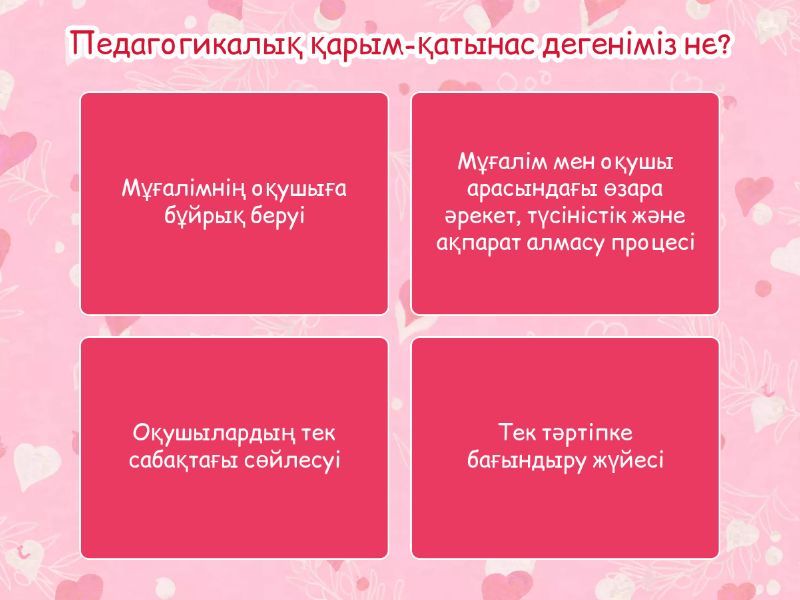 1) Педагогикалық қарым-қатынас дегеніміз не? a) Мұғалімнің оқушыға бұйрық беруі b) Мұғалім мен оқушы арасындағы өзара әрекет, түсіністік және ақпарат алмасу процесі c) Оқушылардың тек сабақтағы сөйлесуі d) Тек тәртіпке бағындыру жүйесі 2) Мұғалімнің қарым-қатынасының басты мақсаты қандай? a) Оқушыларды жазалау b) Тәртіпті қадағалау c) Білім беру, тәрбиелеу және жеке тұлғаны дамыту d) Тест нәтижесін бақылау 3) Авторитарлық стильдің басты ерекшелігі: a) Оқушылармен тең серіктестік орнатады b) Эмоционалды жылы қарым-қатынас c) Оқушының белсенділігі артады d) Мұғалімнің шешім қабылдаудағы үстемдігі және бұйрық беру тәсілі ✅ 4) Демократиялық стильдің негізгі сипаты: a) Мұғалім барлық шешімді өзі қабылдайды b) Мұғалім мен оқушының пікірлері тең бағаланады c) Оқушыларға еркіндік берілмейді d) Тек қатаң тәртіпті талап етеді 5) Либералды (еркін) стильдің кемшілігі: a) Оқушылардың белсенділігінің артуы b) Мұғалімнің тым қатал болуы c) Мұғалім мен оқушының жылы қарым-қатынасы d) Тәртіп пен жүйеліліктің әлсіреуі 6) «Мұғалім – жетекші, оқушы – орындаушы» моделі қай стильге жақын? a) Демократиялық b) Авторитарлық c) Либералды d) Фасилитаторлық 7) . «Мұғалім – фасилитатор, оқушы – белсенді субъект» моделінің басты ерекшелігі: a) Мұғалім оқушы дамуына жағдай жасайды, бағыт береді b) Мұғалім оқушыларды қатаң бақылайды c) Оқушыларға тапсырма берілмейді d) Оқыту тек дәріс түрінде өтеді 8) Педагогикалық қарым-қатынастың негізгі функцияларының бірі: a) Ақпараттық-коммуникативтік b) Әкімшілік c) Экономикалық d) Құқықтық 9) Мұғалімнің қарым-қатынас стиліне әсер етпейтін фактор: a) Мұғалімнің кәсіби деңгейі b) Оқушылардың жас ерекшелігі c) Мектептің дәстүрі d) Ауа райы 10) Қазіргі заман мұғалімінің қарым-қатынасы қандай бағытқа негізделеді? a) Субъект–объект қатынасы b) Субъект–субъект қатынасы c) Тек бақылауға d) Бұйрық пен жазалауға