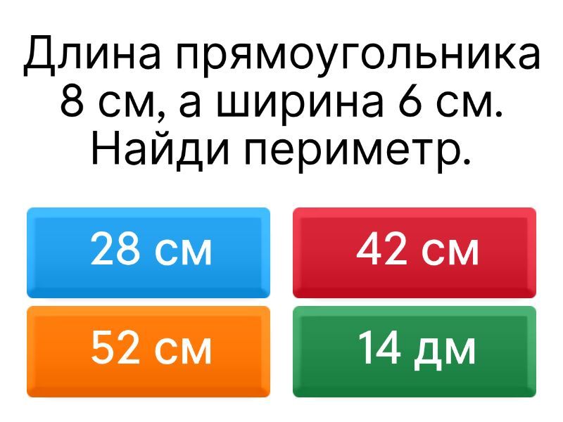 1) Длина прямоугольника 8 см, а ширина 6 см. Найди периметр. a) 28 см b) 42 см c) 52 см d) 14 дм 2) Длина прямоугольника 12 см, а ширина – на 3 см короче. Найди периметр. a) 16 см b) 28 см c) 14 дм d) 42 см 3) Одна сторона прямоугольника 5 см, а другая – на 16 см длиннее. Найди периметр. a) 14 дм b) 52 см c) 42 см d) 28 см 4) Сторона квадрата 4 см. Найди его периметр. a) 28 см b) 52 см c) 42 см d) 16 см 5) Вычисли периметр треугольника со сторонами 3 дм, 5 дм, 6 дм. a) 52 см b) 28 см c) 16 см d) 14 дм