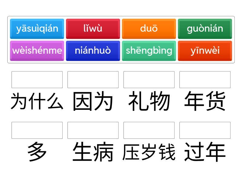 niánhuò - 年货, rènào - 热闹, wèishénme - 为什么, yīnwèi - 因为, hòutiān - 后天, guònián - 过年, yòng - 用, dōngxi - 东西, dāngrán - 当然, lǐwù - 礼物, qùnián - 去年, shōudào - 收到, duō - 多, yāsuìqián - 压岁钱, shēngbìng - 生病,